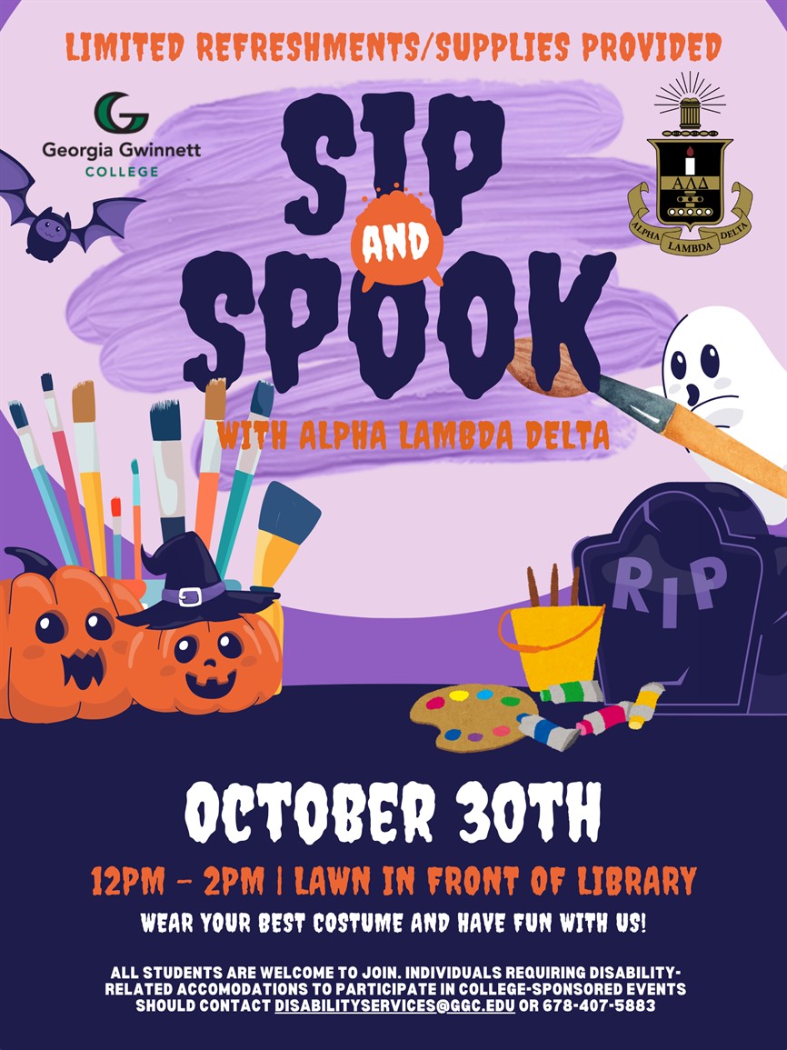 Calling all Halloween enthusiasts and painter extraordinaires! Alpha Lambda Delta Honor Society is hosting a spooktacular sip and paint. Join ALD for a fang-tastic afternoon of spooky snacks, raving refreshments and paranormal painting. Come dressed in your best Halloween costume to add to the fun.